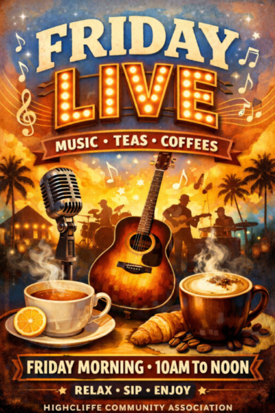 Every Friday morning – Live music. Open to everyone, members and non-members alike. Tea and coffee with biscuits – only £1.00 Bring your friends!